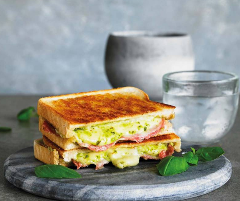 Spread mustard and honey syrup over slices of bread and then put scrambled eggs, meatloaf, and cheese on top. Cut each Panini into half and serve it to your kids.