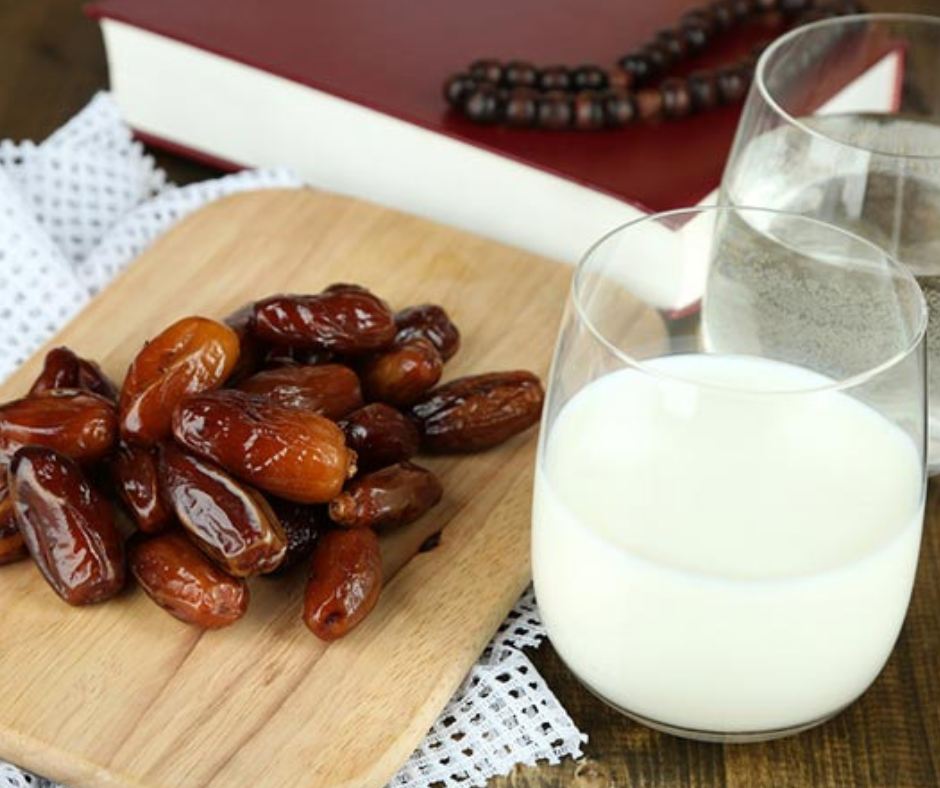 Dates have more carbohydrates than any other food, and essential vitamins including A, B, C, and E. Milk aids in increasing working capacity, and improves mood which is useful during the fasting period.